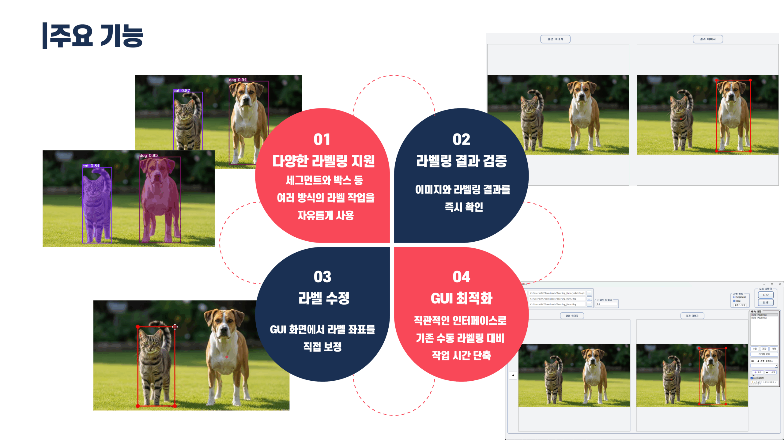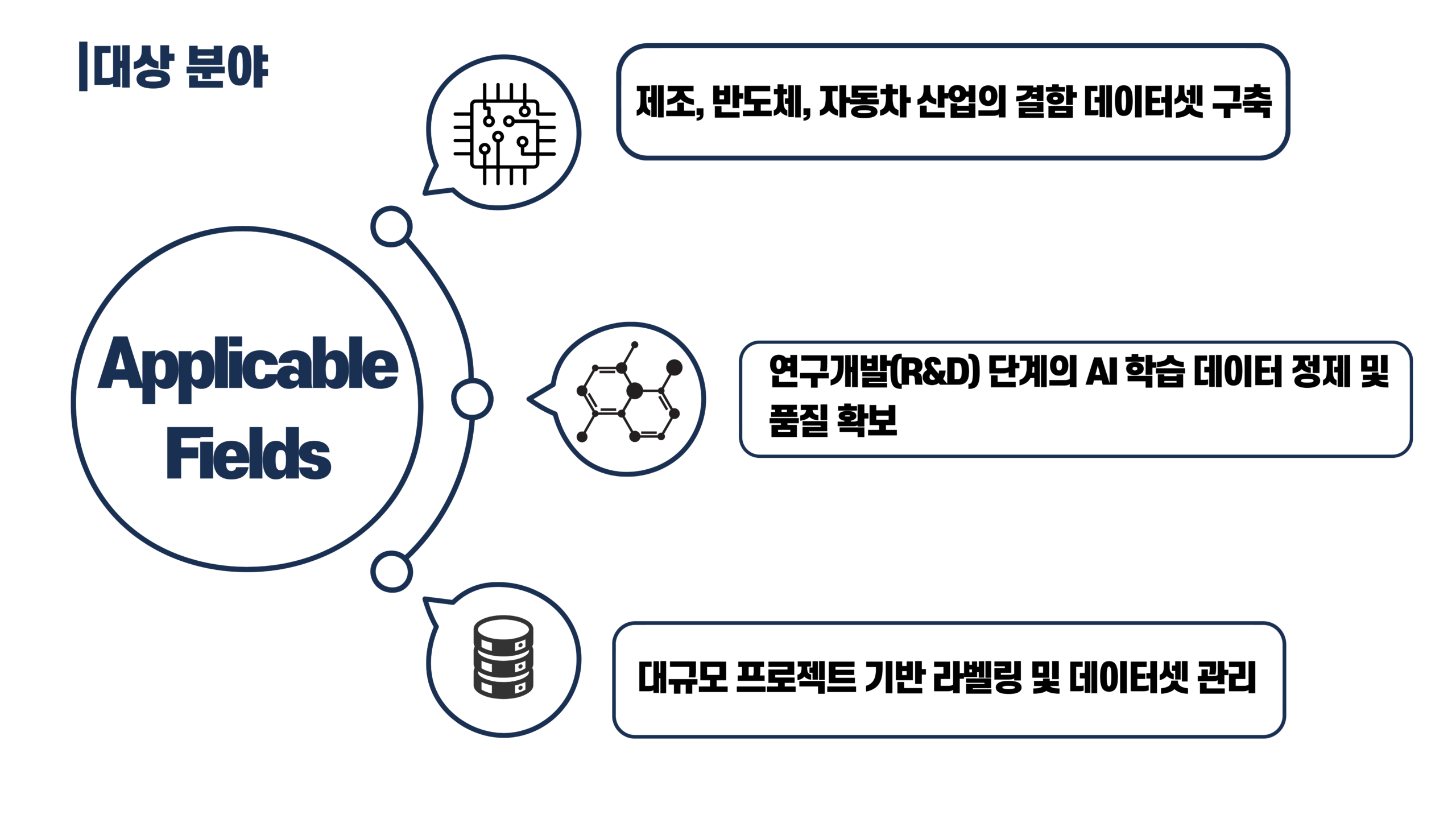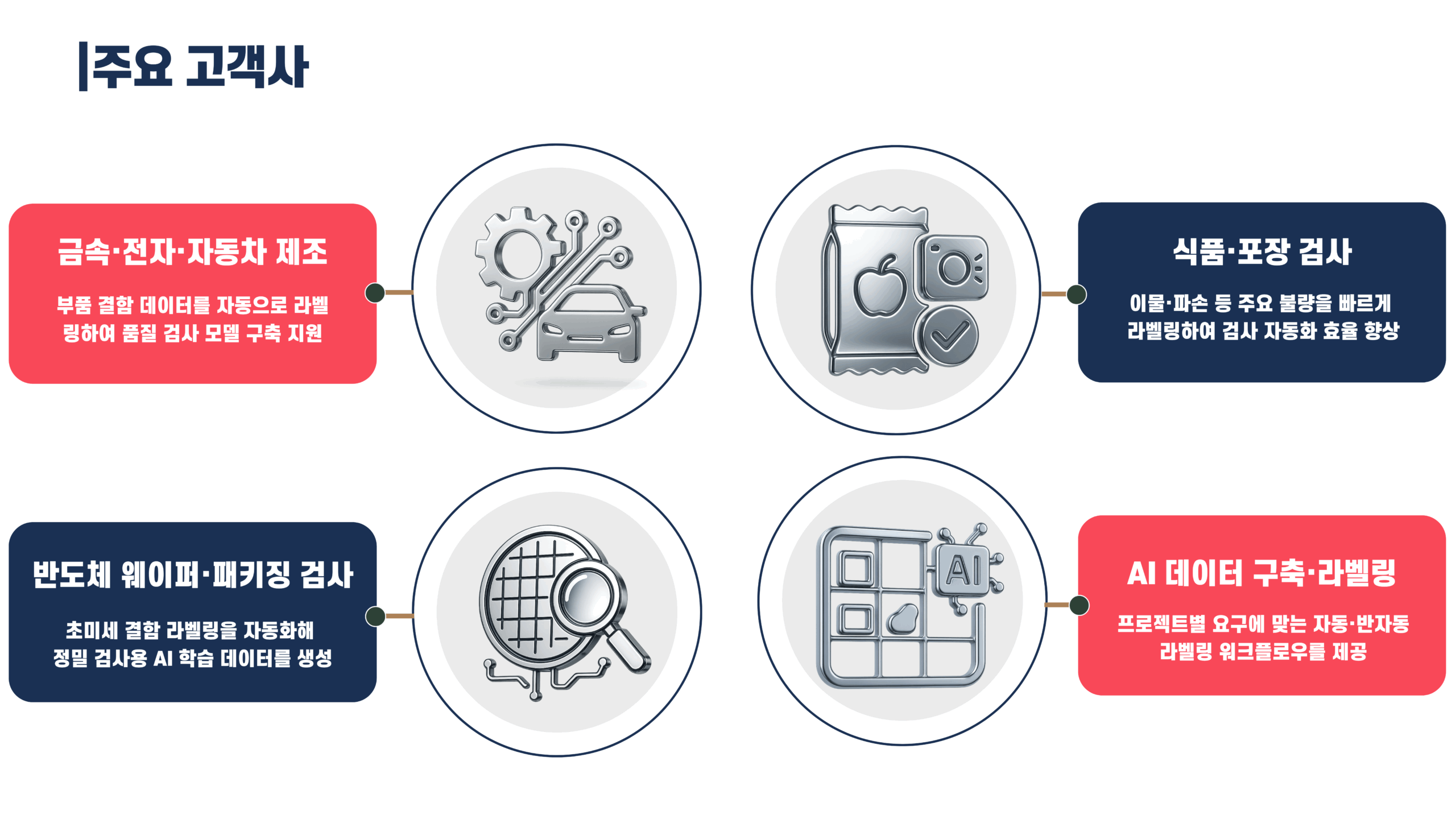 AI 비전 검사 시스템 소개 테프론 튜브 비드 비전 검사 시스템(HawK·AI-TEFLON-I) 테프론 튜브 표면 비전 검사 시스템(HawK·AI-TEFLON-II) 알루미늄 시트 표면 비전 검사 시스템(HawK·AI-ALU-I) AI 자동 라벨링 소프트웨어(HawK·AI-ALABEL-I) AI 데이터 증강 소프트웨어(HawK·AI-IMGEN-I) AI 비전 검사 시스템 (HawK·AI) 비전 센서를 이용해서 표면의 전방위적 결함을 검출하는 AI 비전 검사 시스템 HawK·AI는 생산품 표면의 결함 검사, 실시간 모니터링, 웹페이지를 이용한 관리 감독을 아우르는 딥러닝 소프트웨어입니다. HawK·AI를 통해 제품의 수율 증가, 생산 효율 향상, 품질 향상, 원가 절감 등의 효과를 경험하실 수 있습니다. 자동·반자동 라벨링 지원 소프트웨어(HawK·AI-ALABEL-I) HawK·AI-ALABEL-I은 AI 학습용 데이터셋을 쉽고 빠르게 만들 수 있는 자동·반자동 라벨링 소프트웨어입니다. Segmentation과 Detection을 지원하며, 결과 검증·보정 기능과 프로젝트 기반 관리로 대규모 데이터 구축도 효율적으로 진행할 수 있습니다. 컨설팅 문의