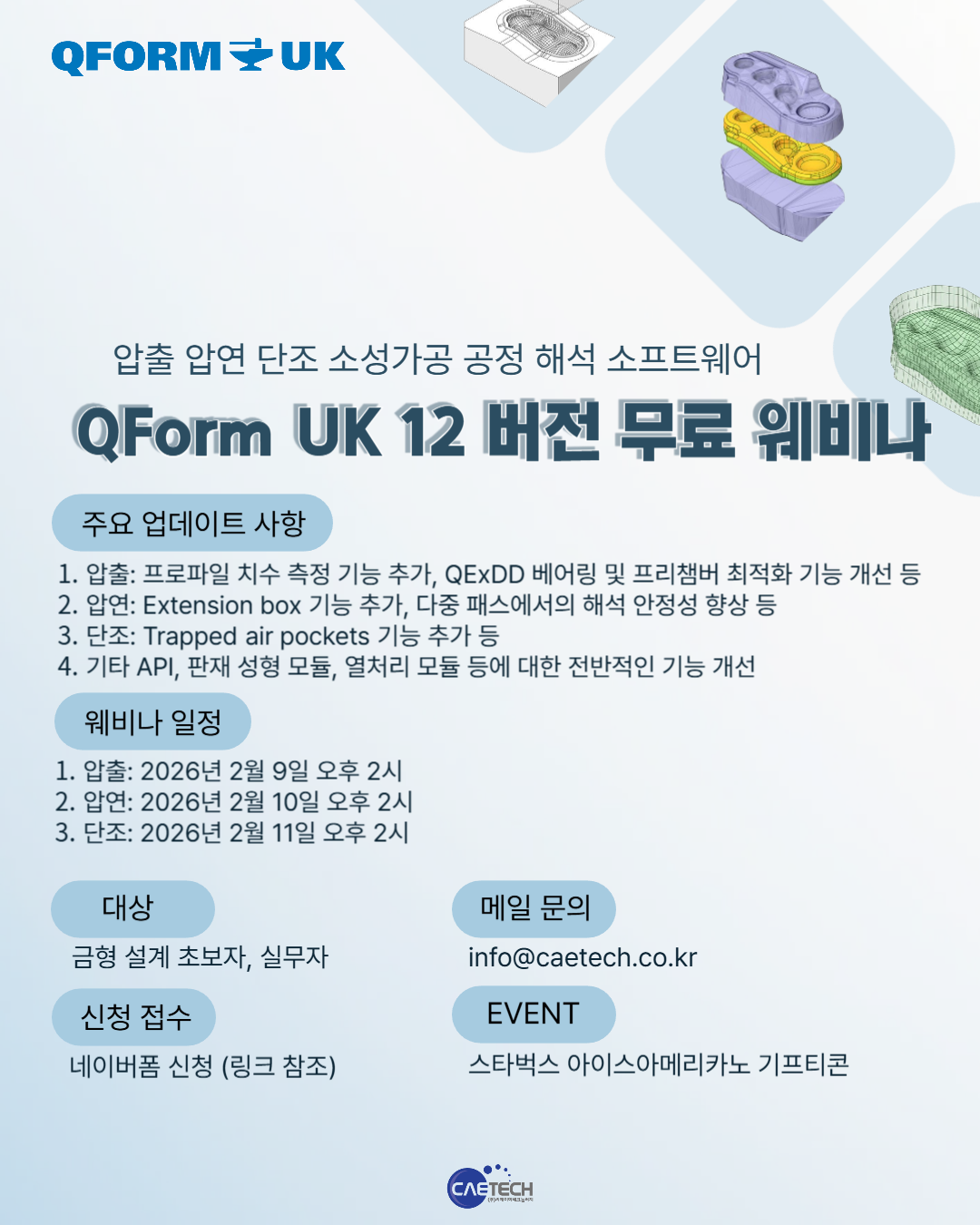 이번 신 버전 무료 웨비나는 QForm UK를 통해 금속 성형 공정 엔지니어링의 수준을 한 단계 높일 수 있는 정보를 확인할 수 있는 기회입니다. 많은 관심과 참여 부탁드립니다.